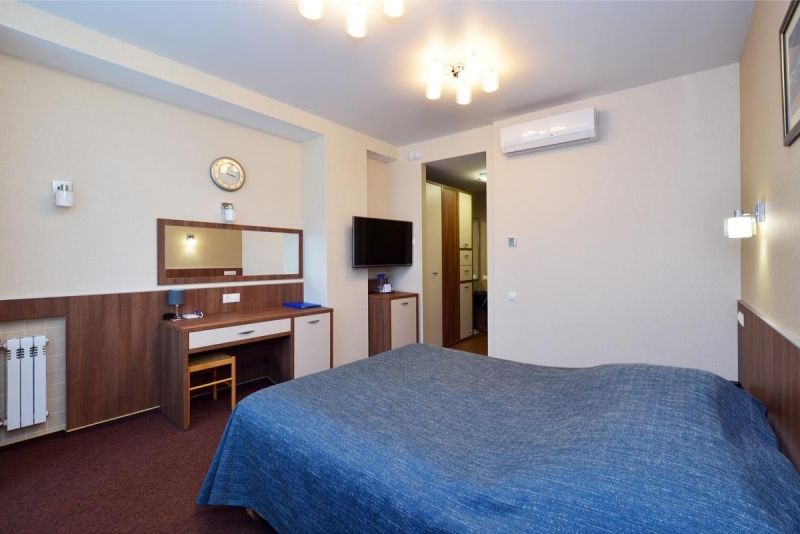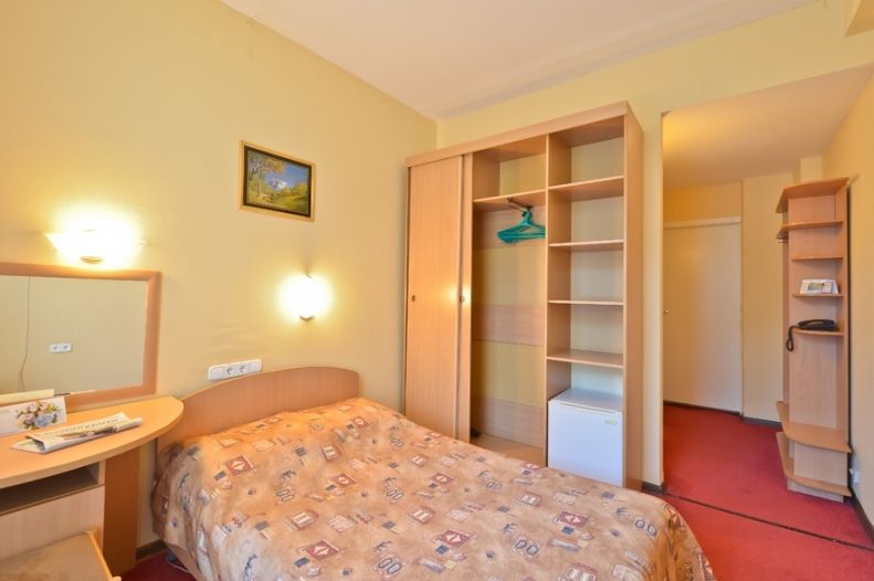 Оборудование номера: кровать полутораспальная, прикроватная тумбочка, шкаф для одежды, стол со стулом, телевизор, холодильник, электрочайник, телефон