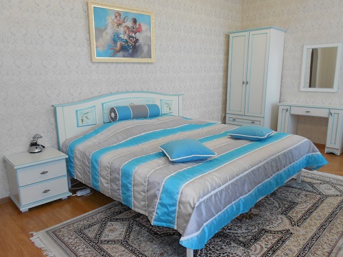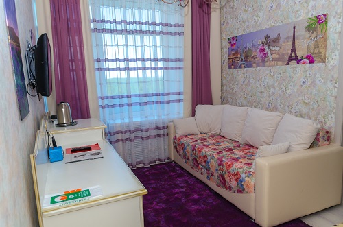 В номере: диван, телевизор, телефон, холодильник, радио, стенка-горка с посудой, журнальный столик, двуспальная кровать, комод.