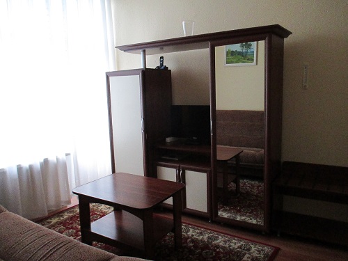 В номере: телевизор, телефон, холодильник, стенка-горка с посудой, радио, двуспальная кровать, 2 кресла- кровати.