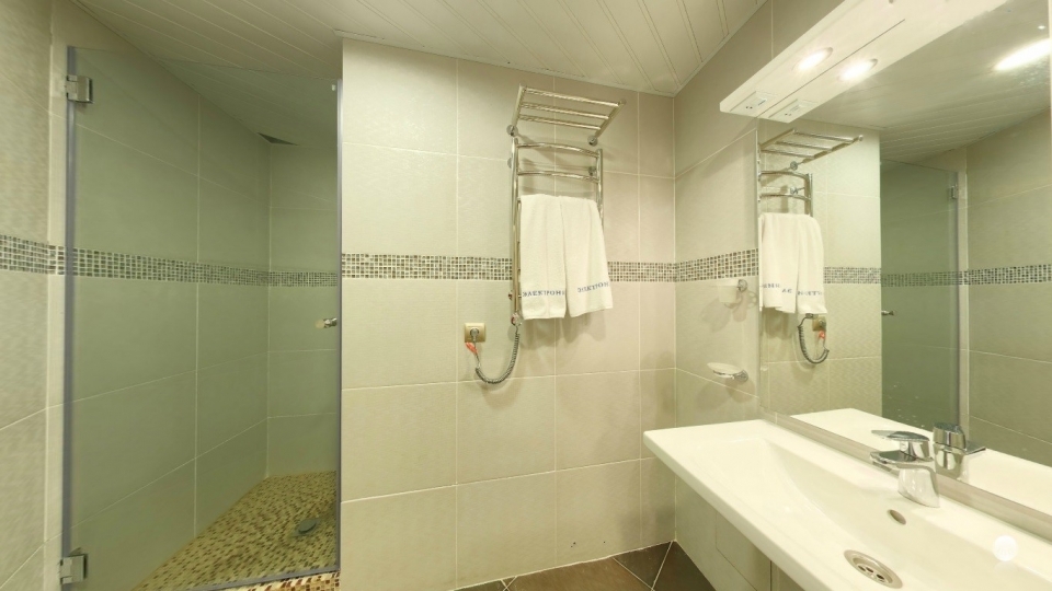 Санузел: совмещенный с душевой кабиной, средства гигиены, пляжное полотенце