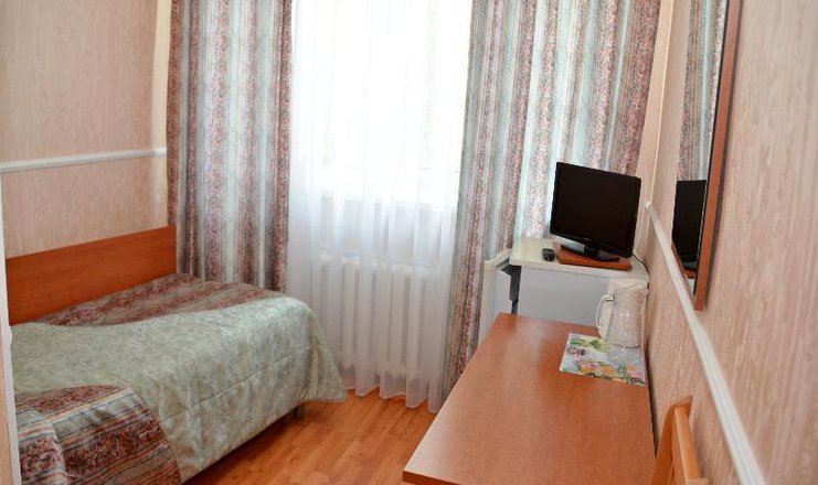В номере: стол, 1 стул, встроенный шкаф-купе, телевизор, холодильник, электрочайник, фен, односпальная кровать.