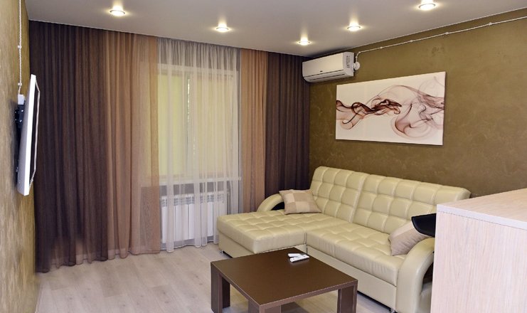 В номере: стол, 2 стула, шкаф, гладильная доска, кондиционер, микроволновая печь, телевизор, утюг, холодильник, электрочайник, мягкая мебель, 2 односпальные кровати, двуспальная кровать (ширина 160 см), кухонный гарнитур, WI-FI, набор полотенец, расширенный набор посуды, предметы индивидуального пользования.