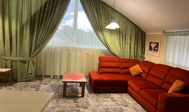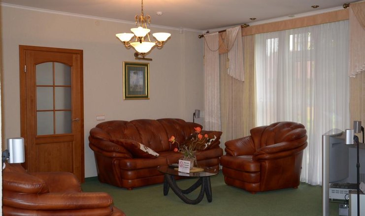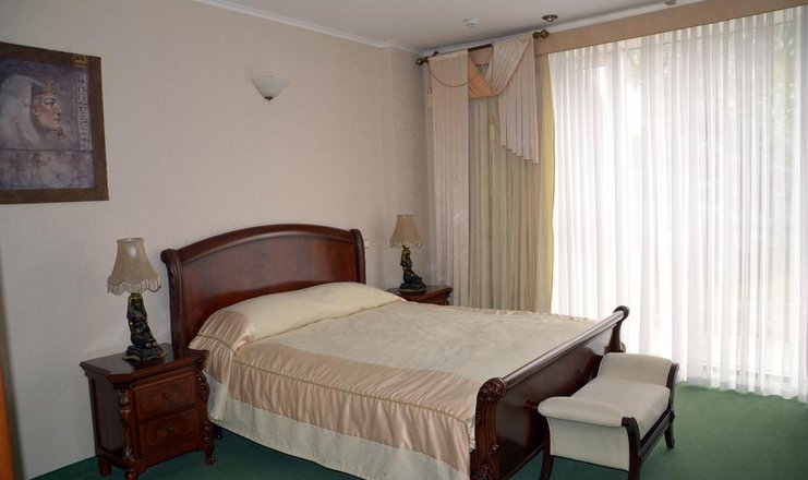 В номере: вешалка, диван раскладной, зеркало, комод, кровать двуспальная, прикроватные тумбочки, стулья, тумба, шкаф-купе, кондиционер, мини-холодильник, сейф, телевизор ЖК, телефон, теплый пол, холодильник, чайный набор посуды, электрочайник