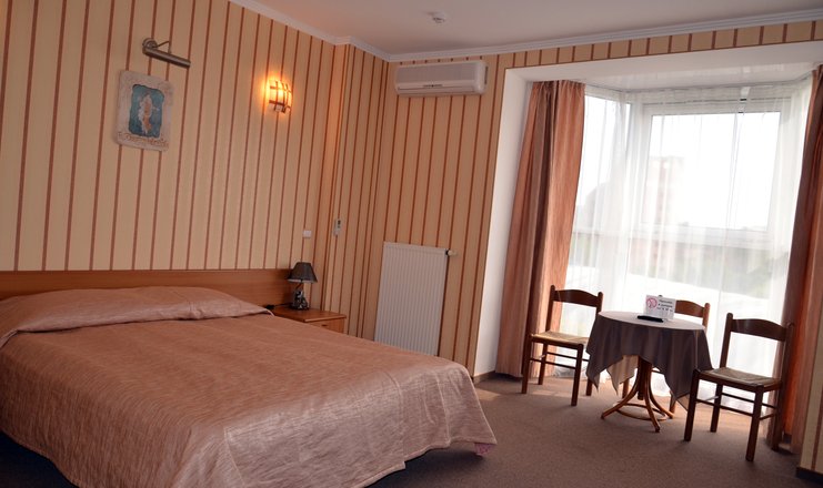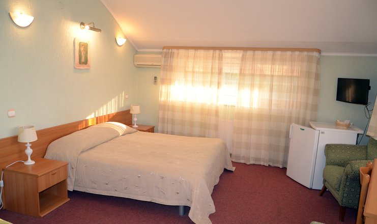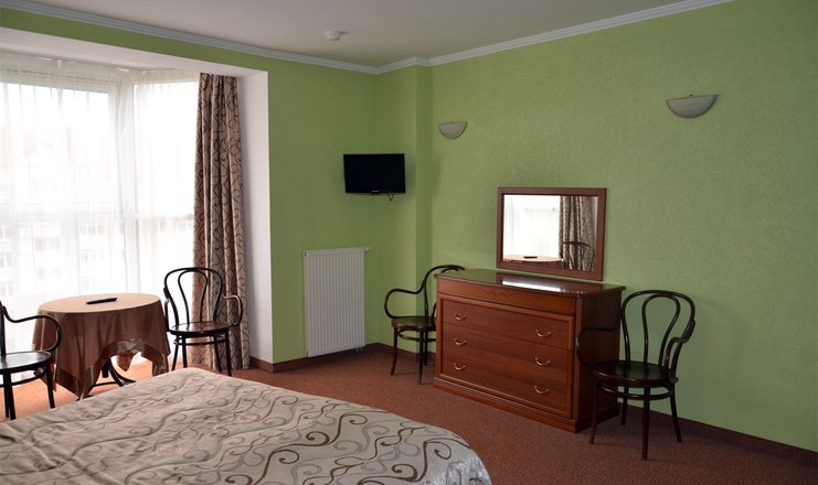 В номере:вешалка, зеркало, кровати односпальные /одна двуспальная кровать, прикроватные тумбочки, стол, стулья, тумба багажная, шкаф-купе, кондиционер, мини-холодильник, телевизор, телефон