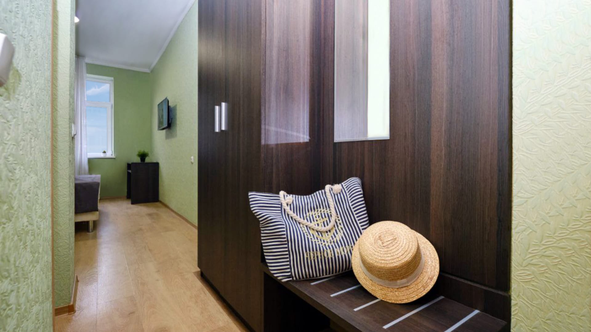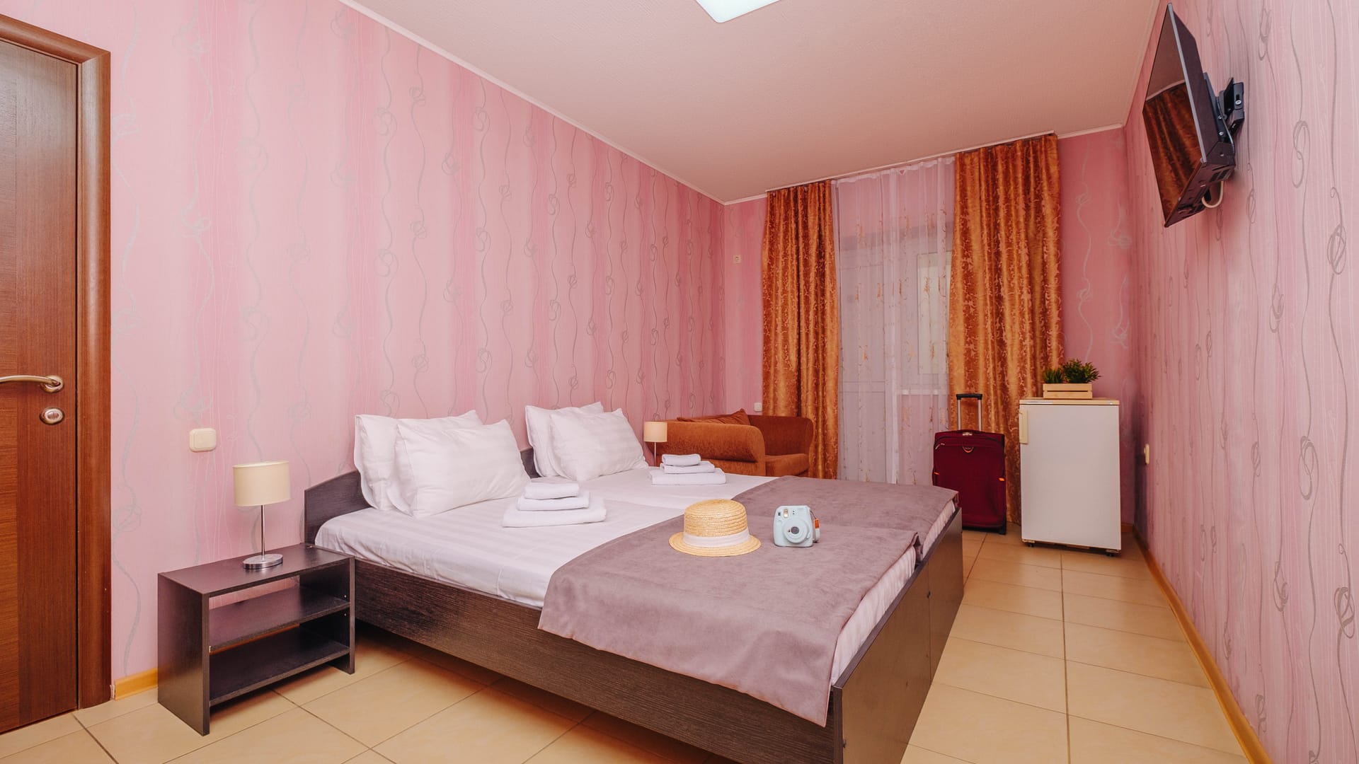 В номере: двуспальная кровать, прикроватные тумбы, стол, стулья, диван или кресло-кровать, шкаф, холодильник, плоский телевизор, кондиционер, чайник, утюг (на этаже)