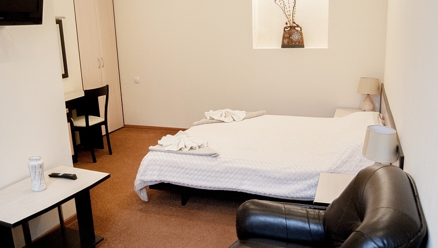 В номере: телевизор, холодильник, диван раскладной, шкаф, тумба прикроватная, набор для ванной, двуспальная кровать или две односпальные кровати, мягкая мебель