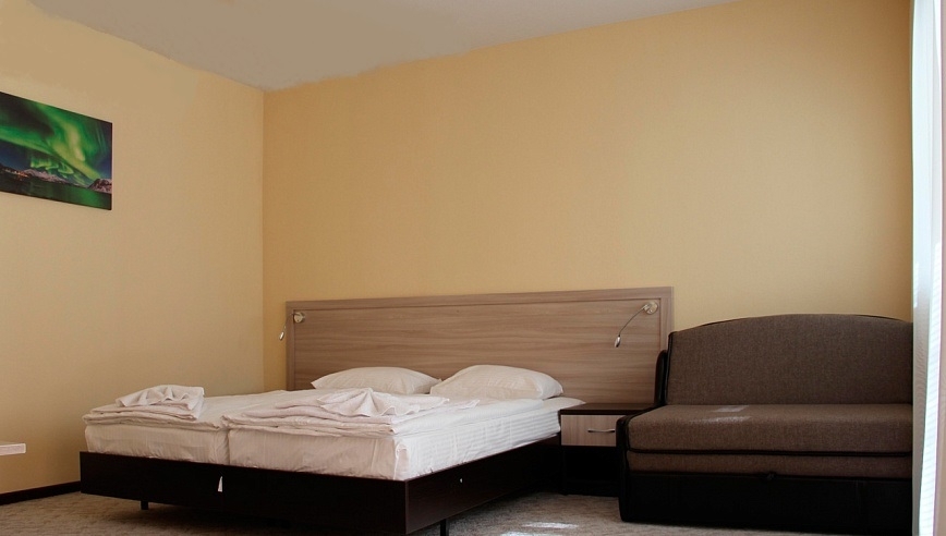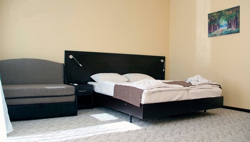 В номере: Спальня с двуспальной кроватью, гостиная-холл с мягкой мебелью, телевизор, холодильник. Детям до 3 лет кроватка предоставляется бесплатно. Дополнительное место - раскладная односпальная кровать.