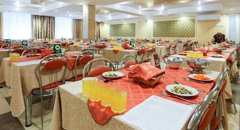 Питание организовано в 2-х столовых. В столовой №1 в двух залах на 50 и 170 мест. В столовой № 2 в двух залах на 140 и 200 мест. Все обеденные залы имеют кондиционер.