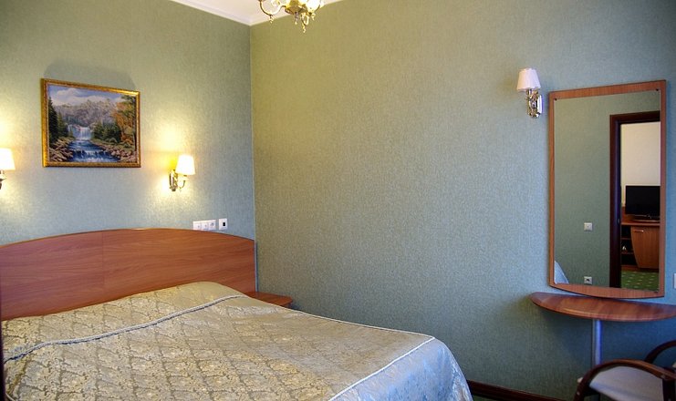 В номере: кровать двуспальная, стол, столик туалетный, стулья, гладильная доска, набор посуды, сейф, сплит-система, телевизор, утюг, холодильник, электрочайник