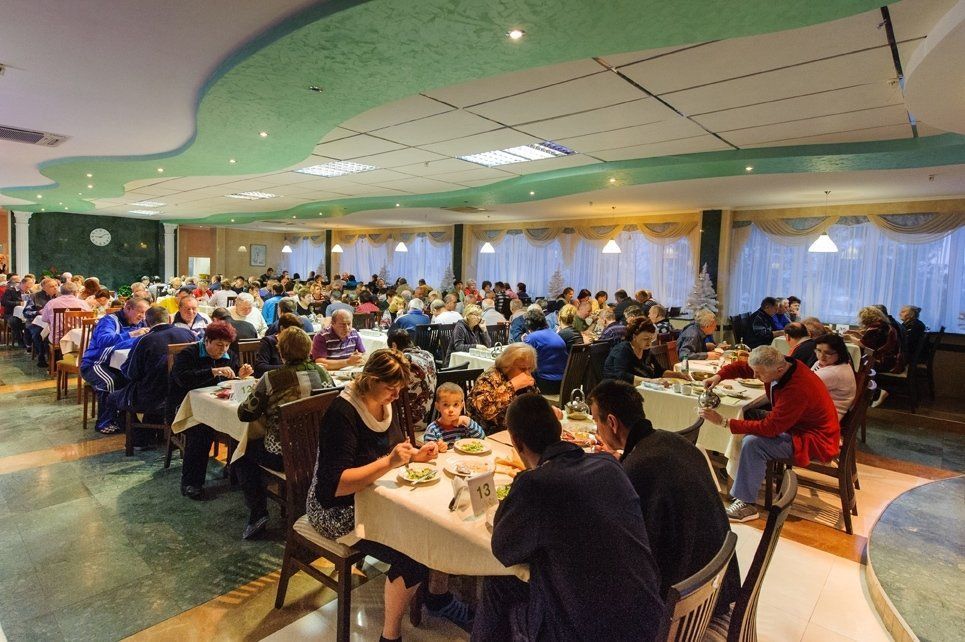 Гостям, проживающим и проходящим лечение по путевке в санатории «Солнечный берег», предоставляется сбалансированное 5-разовое питание по системе «меню-заказ». При составлении плана питания учитываются как медицинские назначения лечащего врача, так и индивидуальные вкусовые пристрастия гостей. Гости могут выбрать для себя питание в соответствии с разработанными разгрузочными диетами, а также постное меню на период религиозных праздников. Также ежедневно в вечернее время в санатории работает бар, где гости могут перекусить между основными приемами пищи, а также выпить прохладительные или горячие напитки.