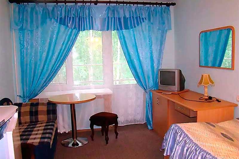 В номере: холодильник, телевизор, телефон, фен, электрочайник, мягкая мебель