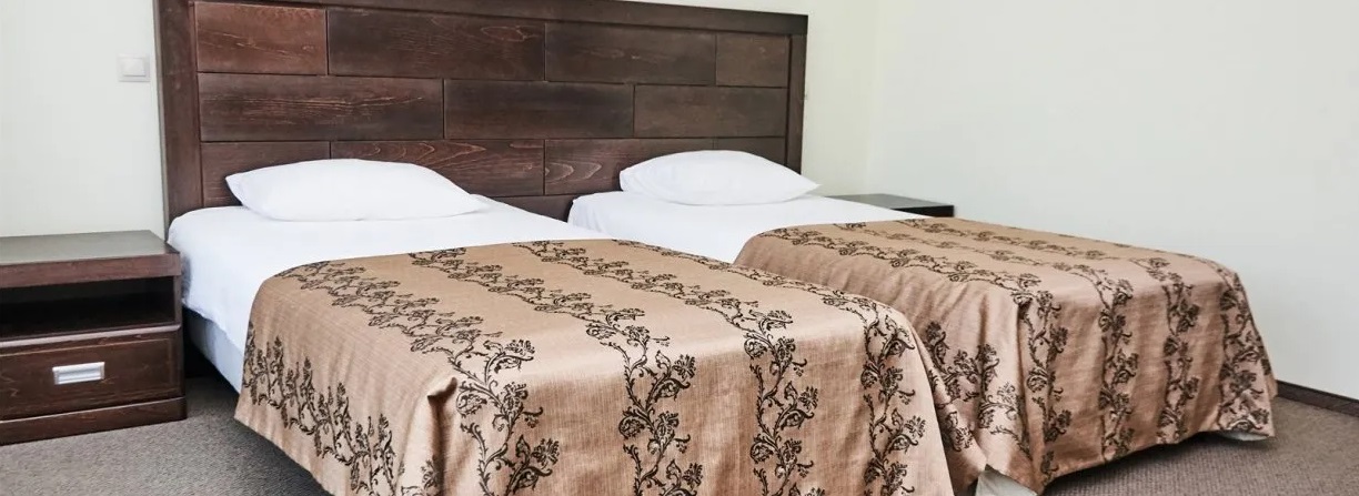 В номере: багажная тумба, зеркало, две полутораспальные кровати, тумбы, стулья, шкаф-купе, телевизор, светильник, электронные замки, Wi-Fi, телефон