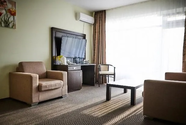 В номере: кровать «King-size», два телевизора, светильник, электронные замки, кондиционер, Wi-Fi, телефон, зеркало, кресло, тумбы, стулья, диван, вешалки, чайник, чайный набор, шкаф-купе