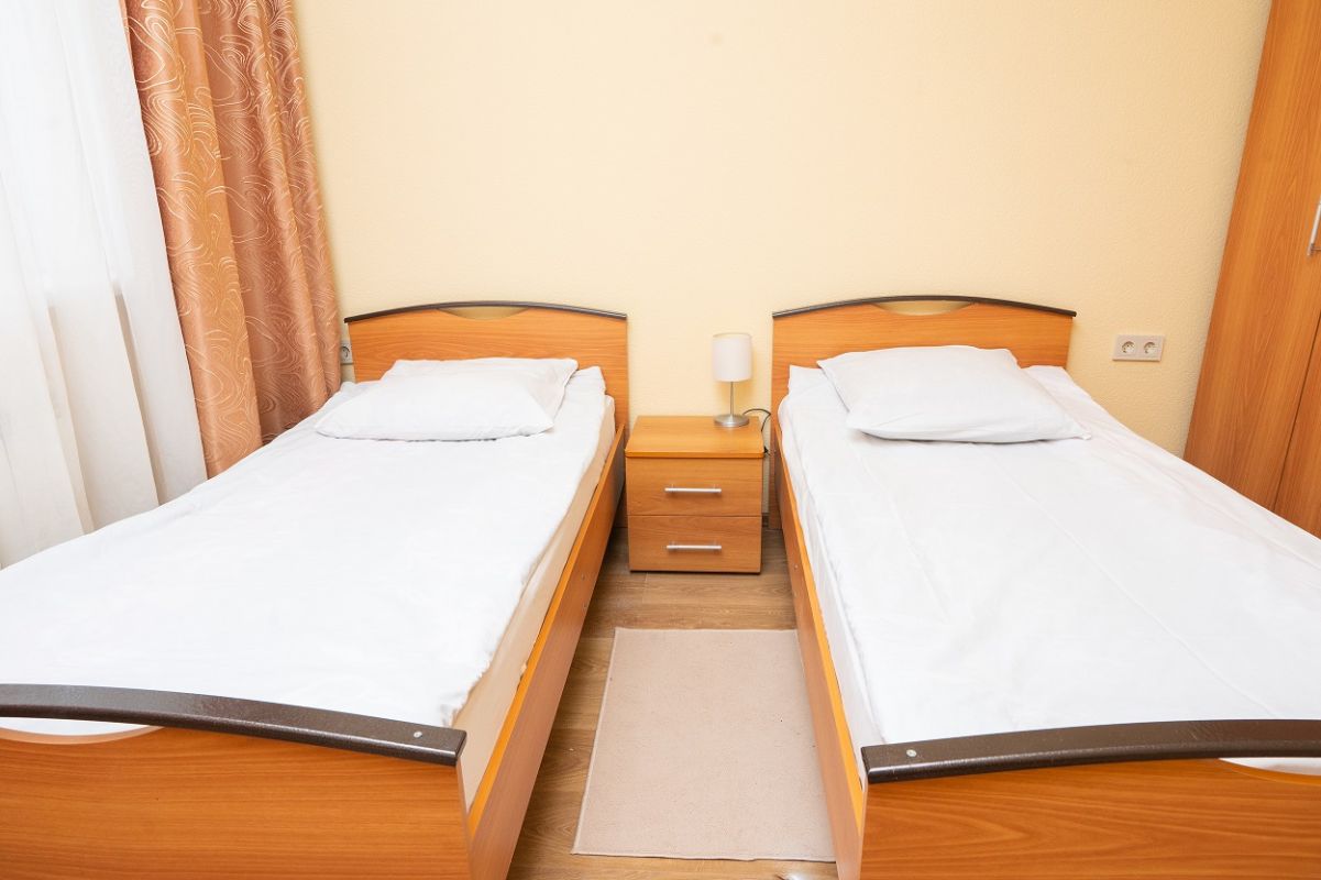 В номере: две односпальные кровати, шкаф, стол, стул, холодильник.