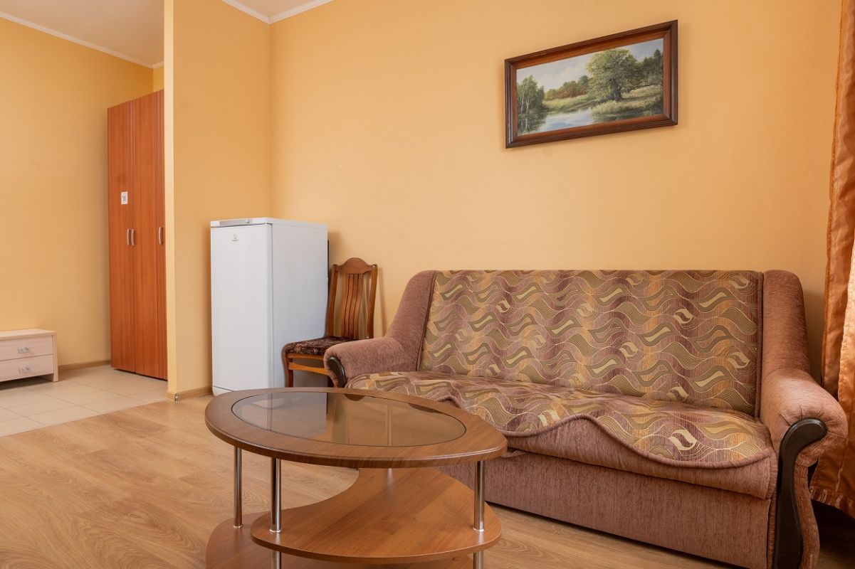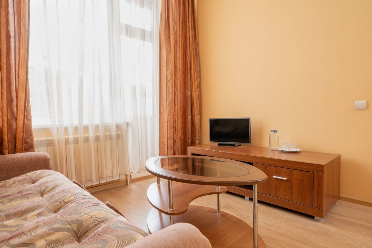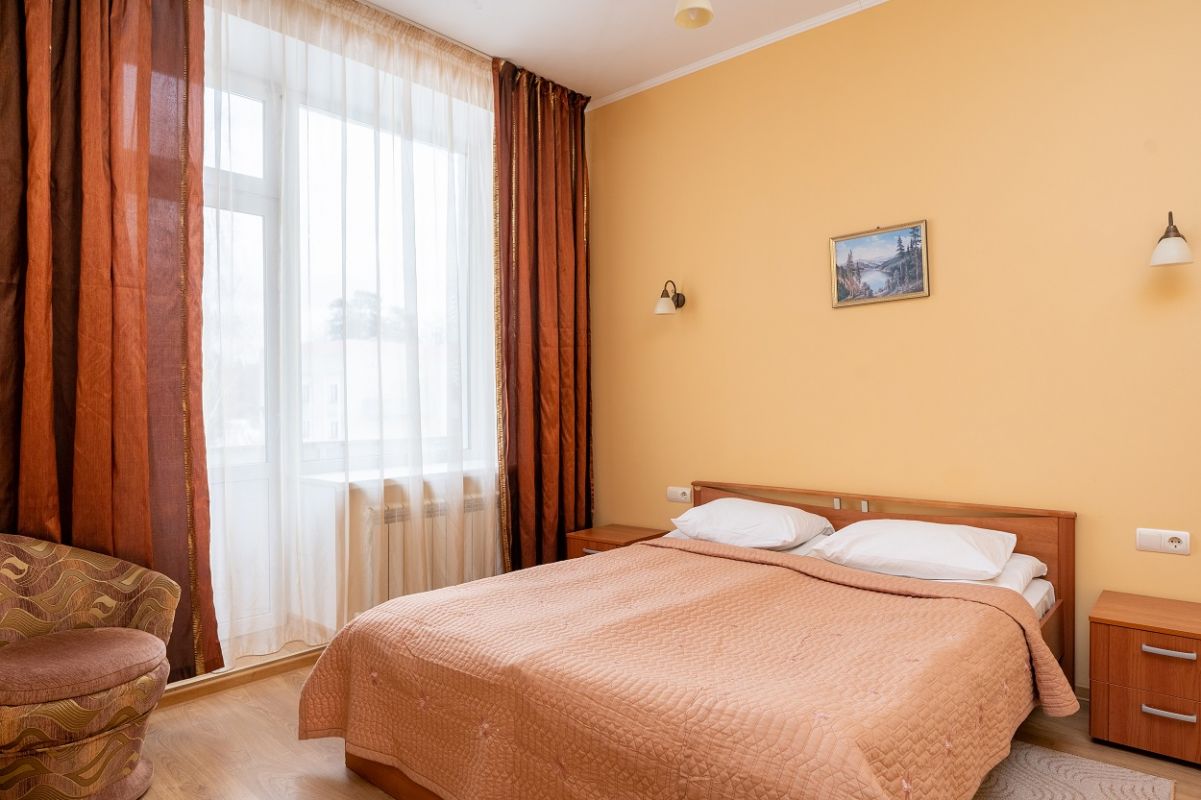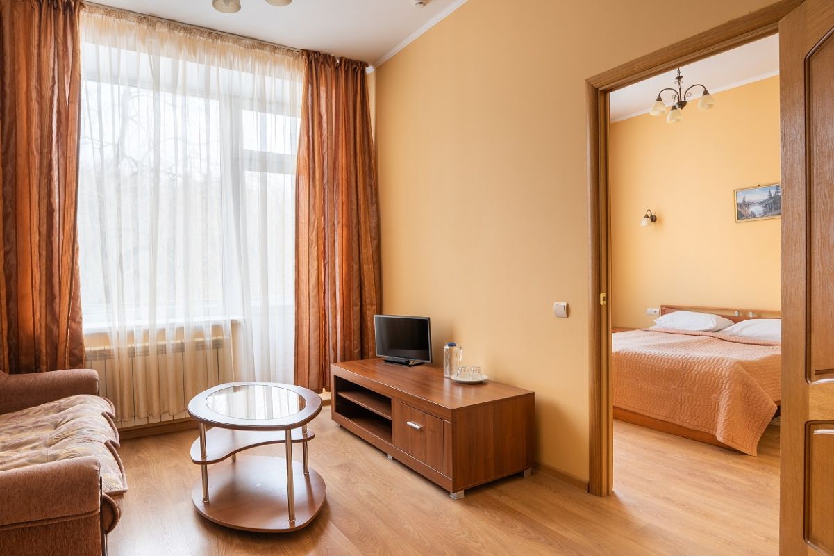 В номере: спальня, гостиная, ванная комната. В спальне: двуспальная кровать. В гостиной: диван, ТВ, холодильник, в ванной комнате: ванна или душ, туалет.