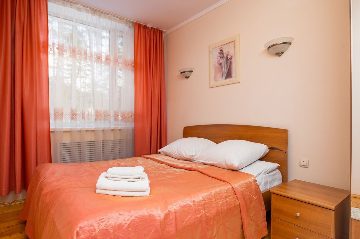 В номере: 2 спальни, гостиная с кухонной зоной, ванная комната. В спальне 1: двуспальная кровать, в спальне 2: двуспальная кровать, в гостиной: диван, ТВ. В кухонной зоне: СВЧ-печь, чайник, холодильник, набор посуды, обеденный стол. В ванной комнате: ванна или душевая кабина, туалет.