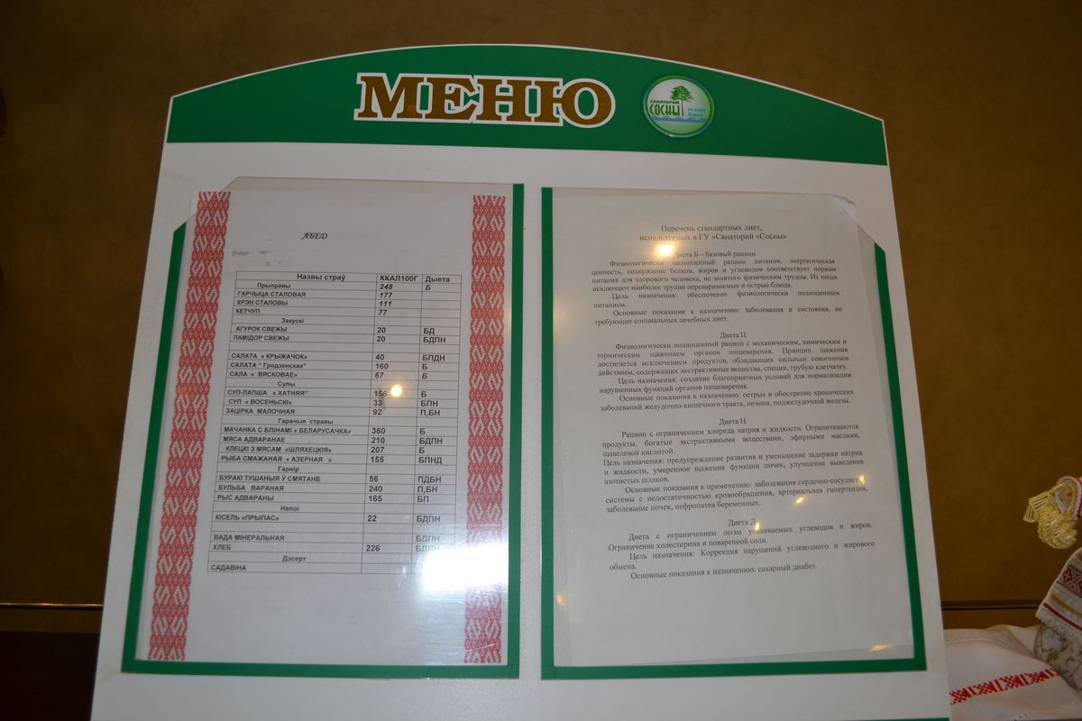 В нашем санатории мы уделяем большое внимание не только лечению и оздоровлению, но также и питанию наших гостей. Мы предлагаем разнообразное трехразовое питание по типу "шведский стол" в двух обеденных залах корпуса "Главный" на 1 этаже.