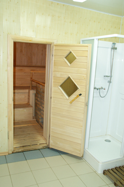 Здание сауны отдельностоящее. Сауна состоит из комнаты отдыха, душевой с небольшим 3 х 3 м. бассейном и, непосредственно, парного отделения, снабженного финской электро-печью. Температуру в парном отделении можно отрегулировать до 120 градусов.