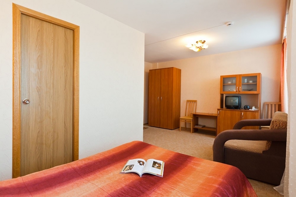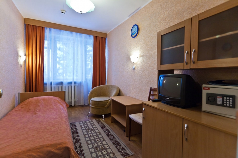 В номере: односпальная кровать, ТВ, холодильник, кресло, журнальный стол, телефон, сейф, шкаф, кондиционер,