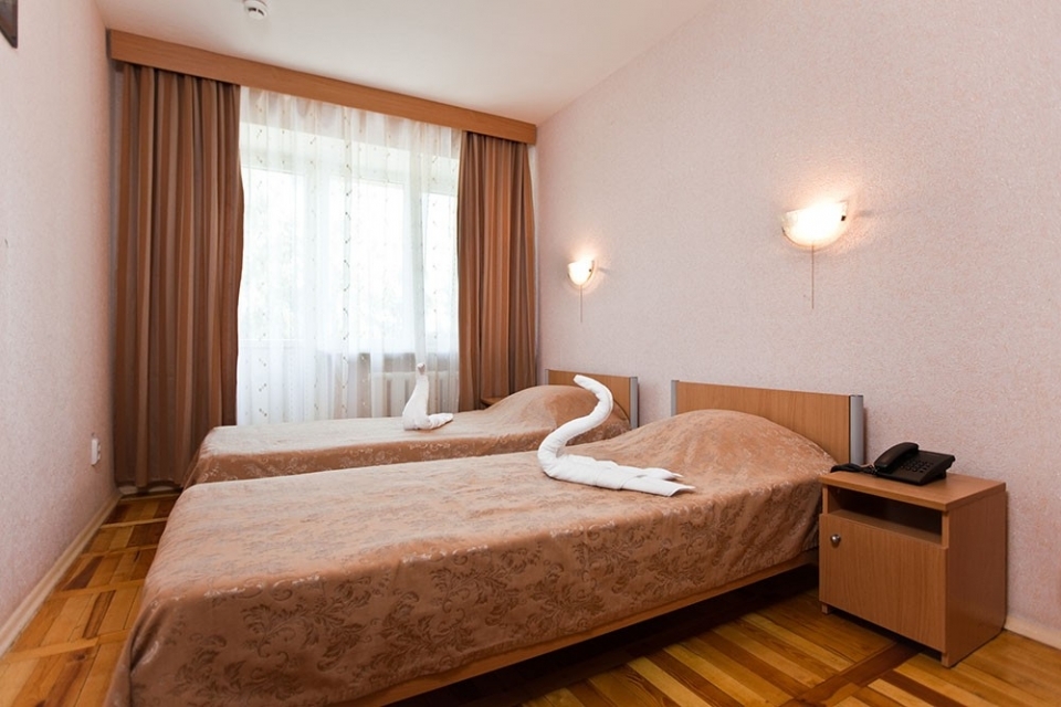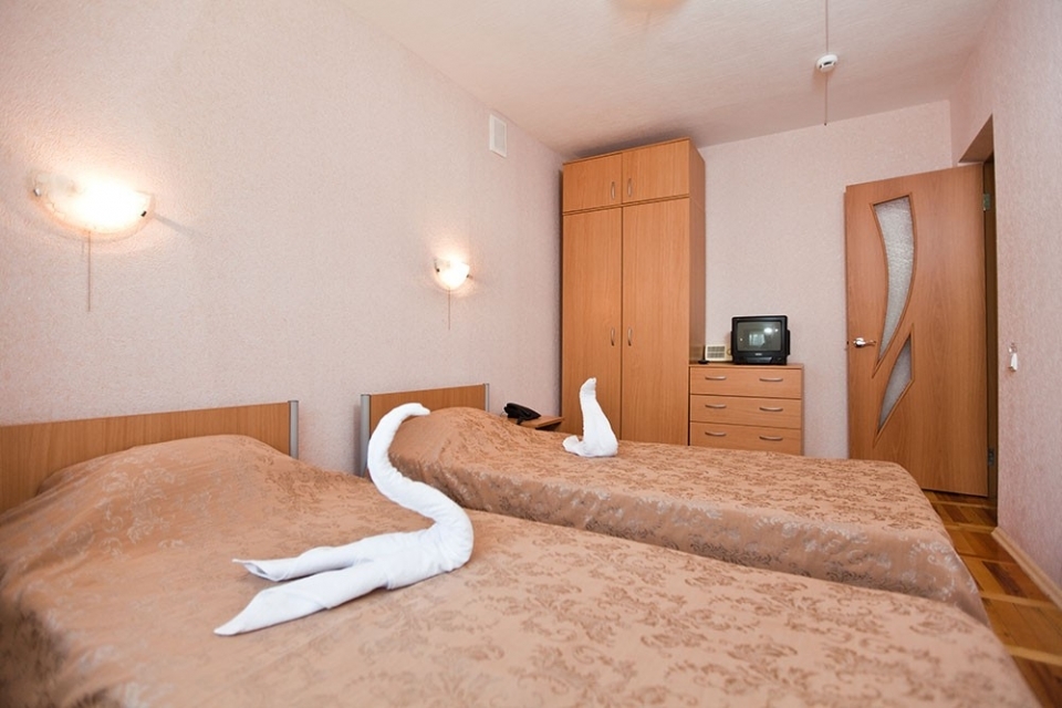 В большой комнате: две 1-спальные кровати, прикроватные тумбы, шкаф для одежды, комод, ТВ, кондиционер, радио, телефон.