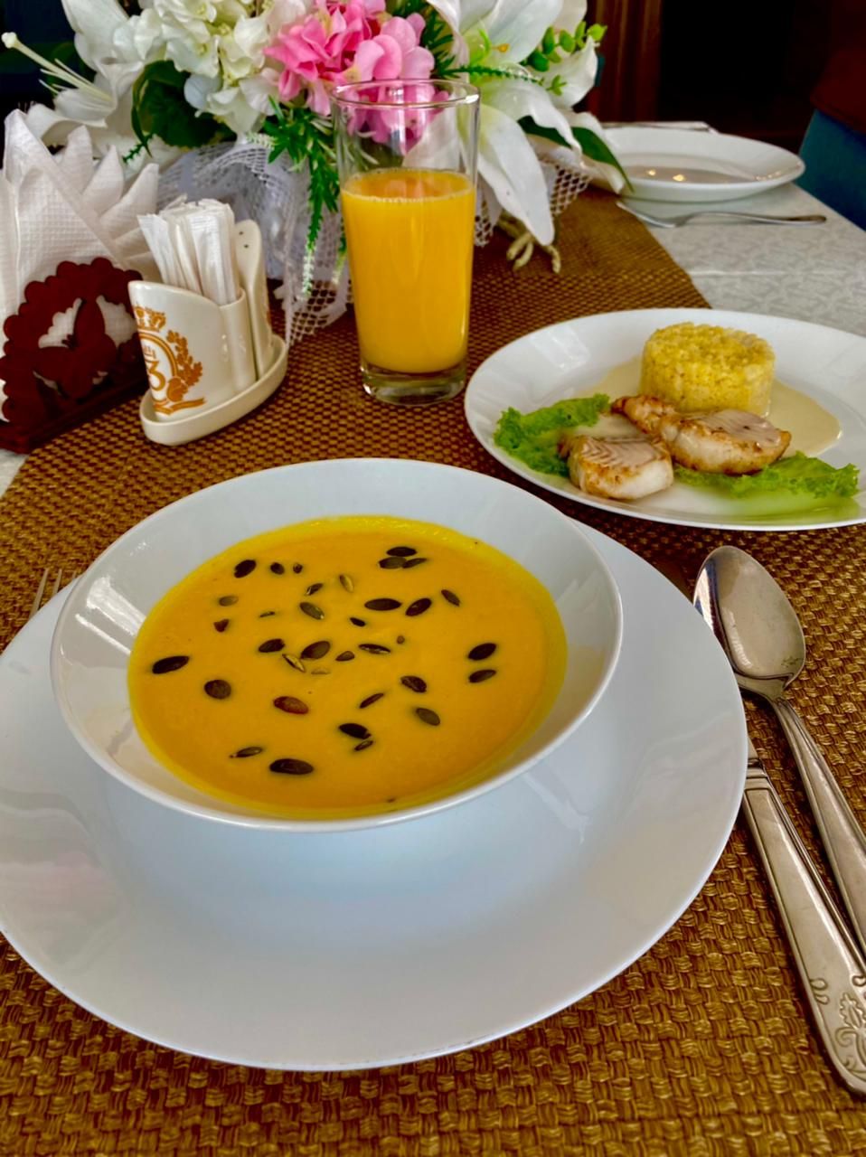 Санаторий "Затишье" располагает просторным, уютными и светлым залом питания. Зал вмещает до 200 персон, для удобства размещения гостей - зонирован гардинами. Из огромных панорамных окон открывается шикарный вид на благоустроенную территорию санатория. Оформление зала в теплых бежево-коричневых тонах придает ему особую уютную атмосферу.